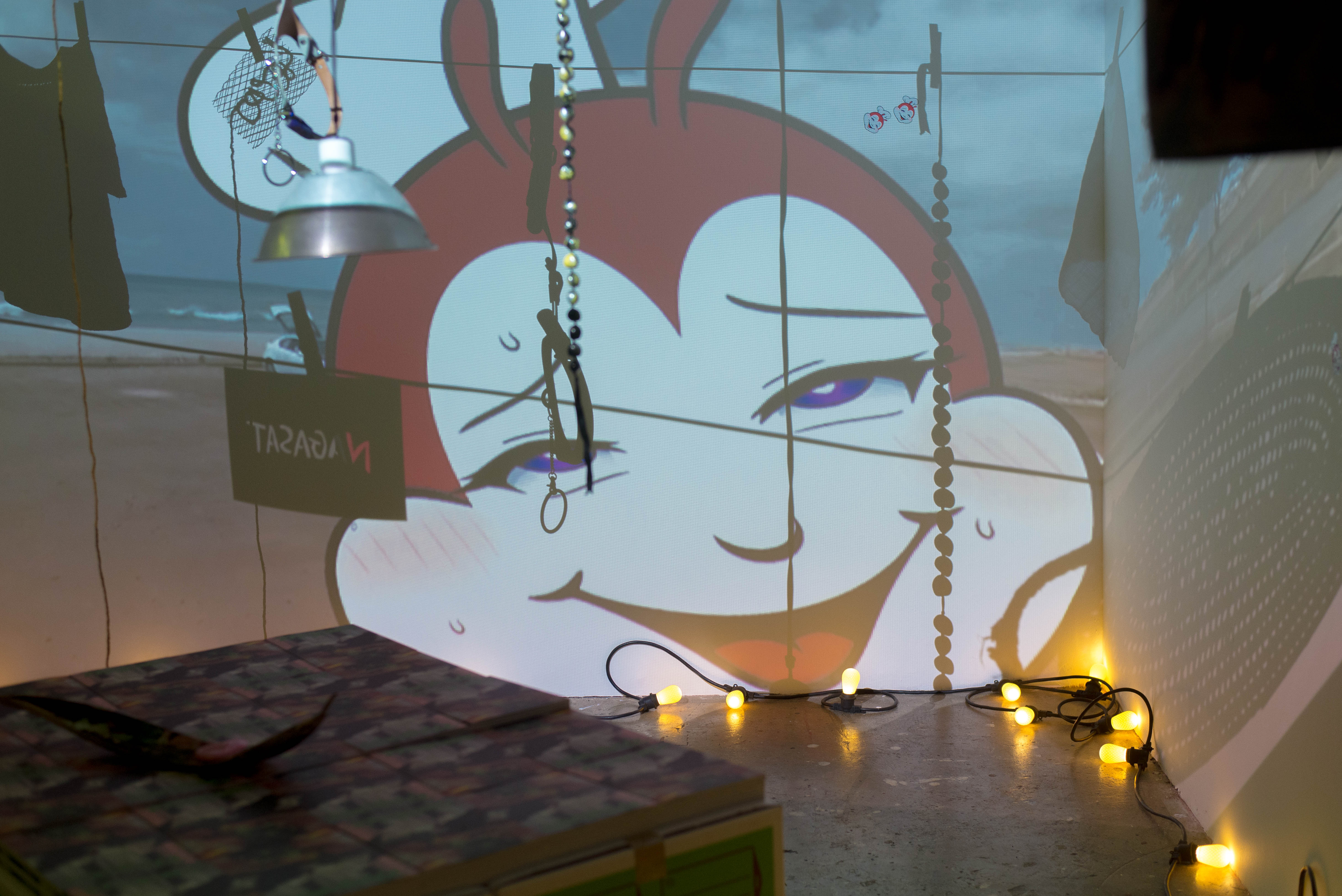 The print release of Tropic Issue 2 corresponded with a gallery exhibition at Aupuni Space. This exhibition incorporated and expanded upon the editorial content of Issue 2, with a curatorial focus on experiential and performative works by Hawaiʻi-based artists. This included an immersive audio soundtrack, TheNightBus, by e-nico, anon, and frntbznzz, an ongoing merch shop with shirt collaborations by Myka Arnado, Jourdan Simmonds, a commissioned video work from e-nico, and “get ready with gentofish,” an ongoing participatory vanity table.
